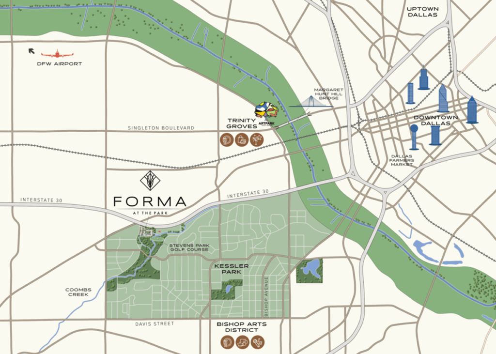.Forma offers a serene escape from the city’s hustle and bustle. For green trails and community events, there’s a park in every direction, including Kessler Park, Kidd Springs, and Klyde Warren Park. Lower your par at The Stevens Park Golf Course located adjacent to Forma and which some of our units overlook. Fall in love with all things local at the Twelve Hills Nature Center and nearby nature preserve . Stop to smell the roses at The Rose Garden Pavilion and the Dallas Arboretum and Botanical Garden – located just down the street from your Dallas luxury apartment. With plenty of picnic and pet friendly green spaces nearby, you’ll have no shortage when it comes to connecting with nature. Feel like staying close to home? Our unparalleled low-density dwellings were thoughtfully designed to integrate with the topography and natural surroundings they were built on. Listen to the leaves blow and watch the grass grow.